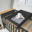A contemporary cot bed complete with matching cot top changer and mattress. The slate grey and oak Rio cot bed holds all your nursery essentials in one stylish, affordable package.