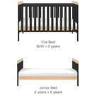Cot Bed is suitable from birth up to approximately 6 years converting from a cot into a junior bed. Three position mattress height with fixed side rails including two protective teething rails. Cot Top Changer attaches securely on the top of the cot bed to provide comfortable changing facilities.