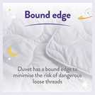 I bought 2 of these for my children, I had to wait for collection as my local store only had 1 so waited for delivery from another store. Unfortunately both duvets had a manufacturing fault where the outer fabric was not sewn in one end and all the filling was spilling out. Also the stitches down the length of the duvet were loose and coming apart. Overall very poor quality considering this is labelled a luxury duvet. Also the listing states the duvet had bound edges for safety and to avoid loose threads, this is untrue. The pictures are completely different to the actual product.