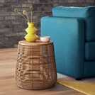 Bring a natural touch to your living area with the Hazel natural rattan side table. Handwoven in India, this side table is full of visual interest thanks to its striking mix of materials and textures. With a real rattan base and oak veneer top, Hazel will soon become the talking point of your home. Perfect for placing in a living room or conservatory, theres plenty of space for a table lamp and cups of tea, but remember to place down coasters to protect the surface from excess heat and scratches.